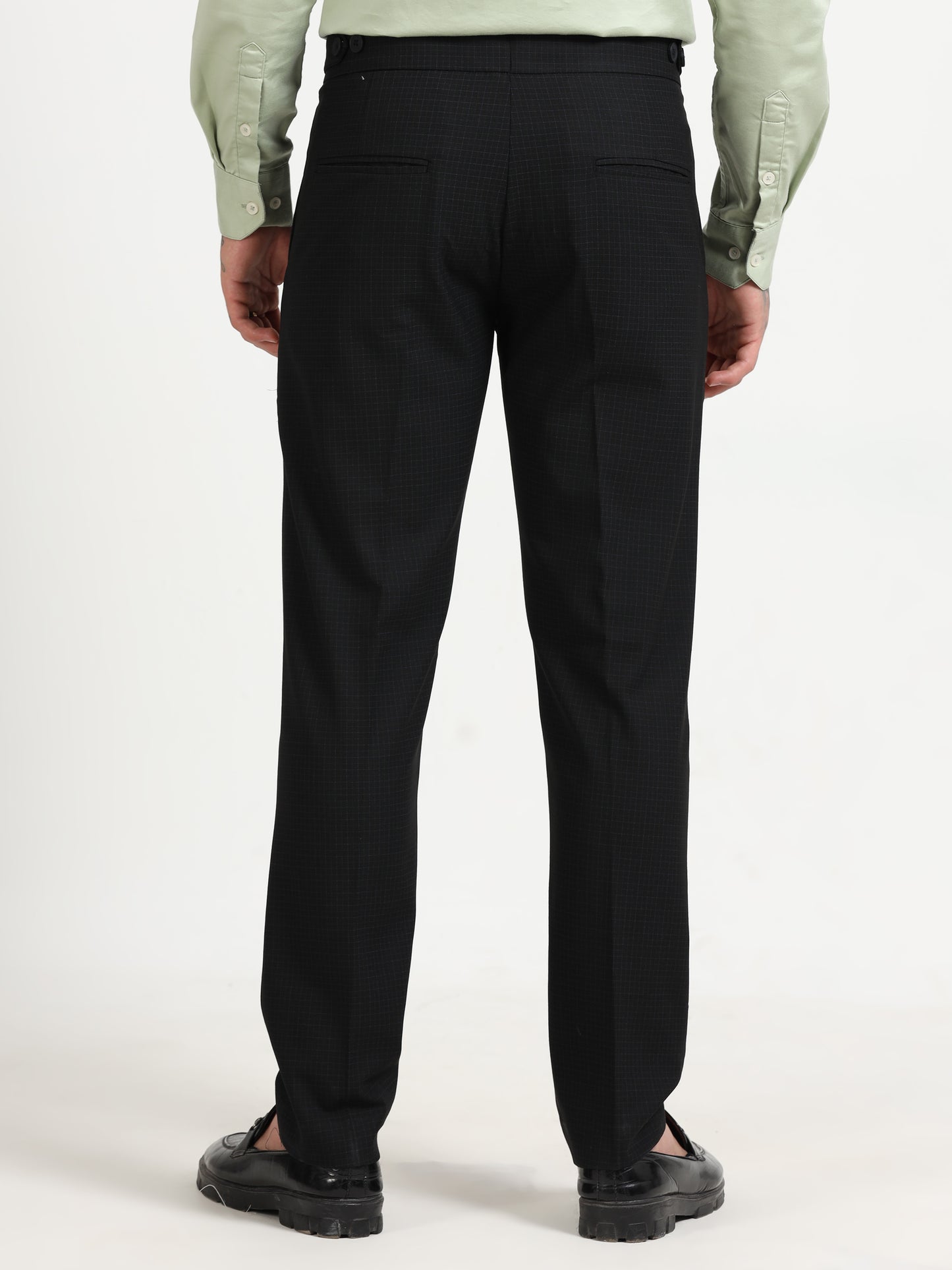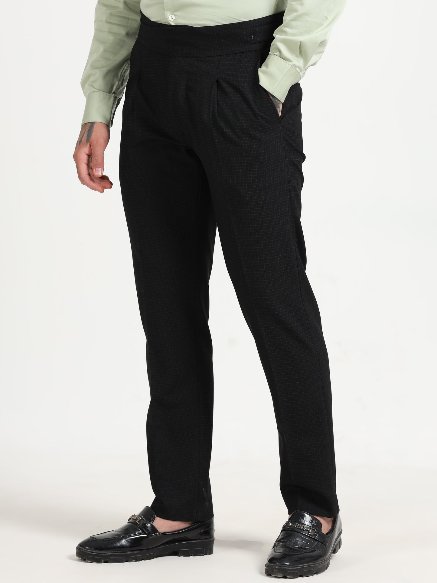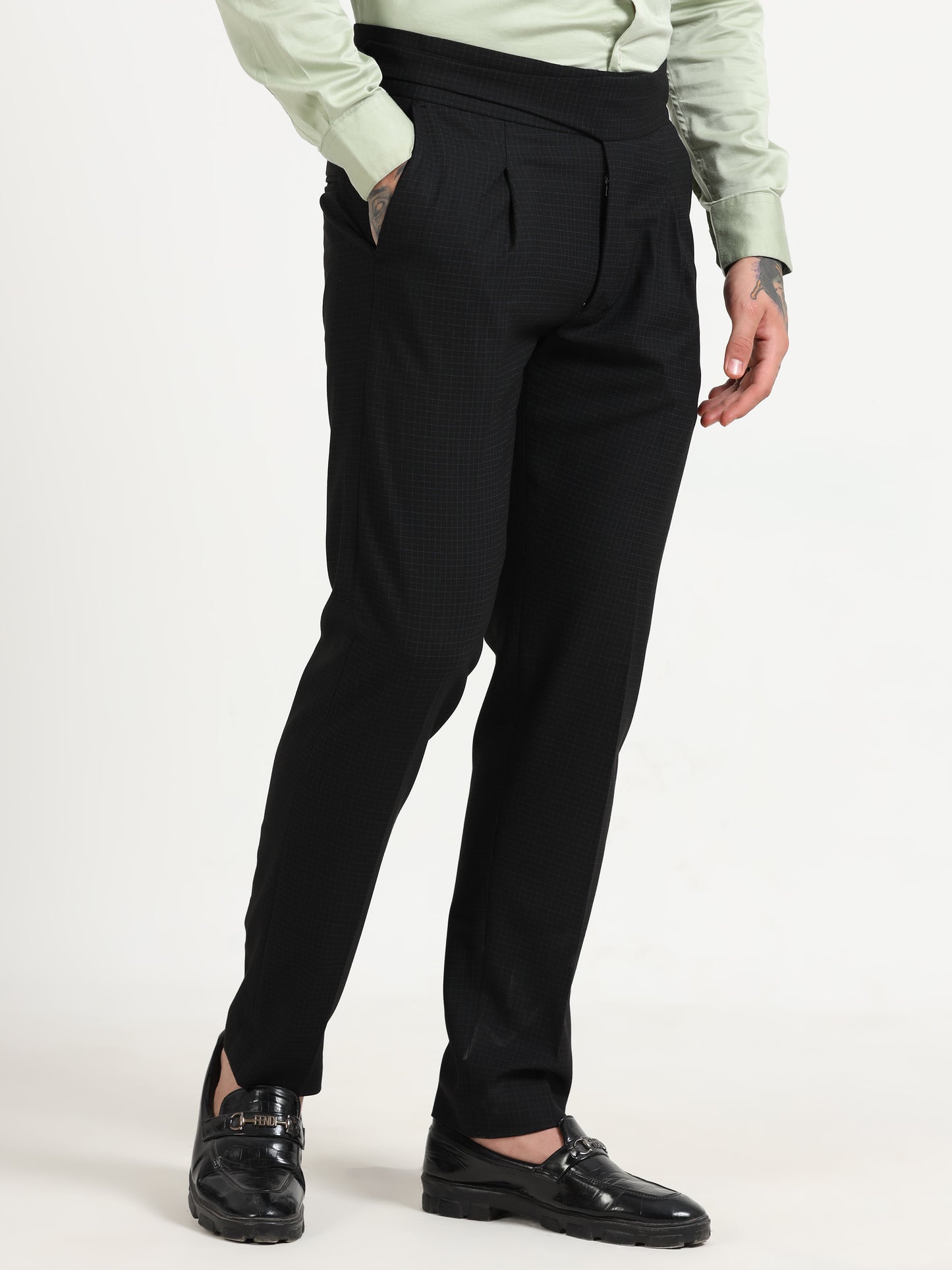 Crafted in deep black with understated micro checks, these Gurkha pants merge military-inspired styling with contemporary tailoring. The crisp pleats and high-waisted design offer a sleek profile.