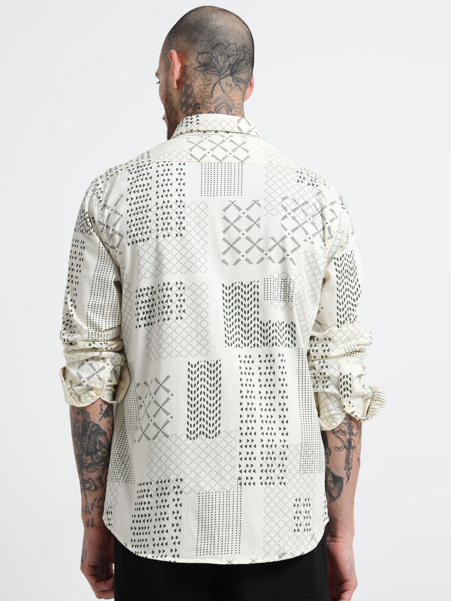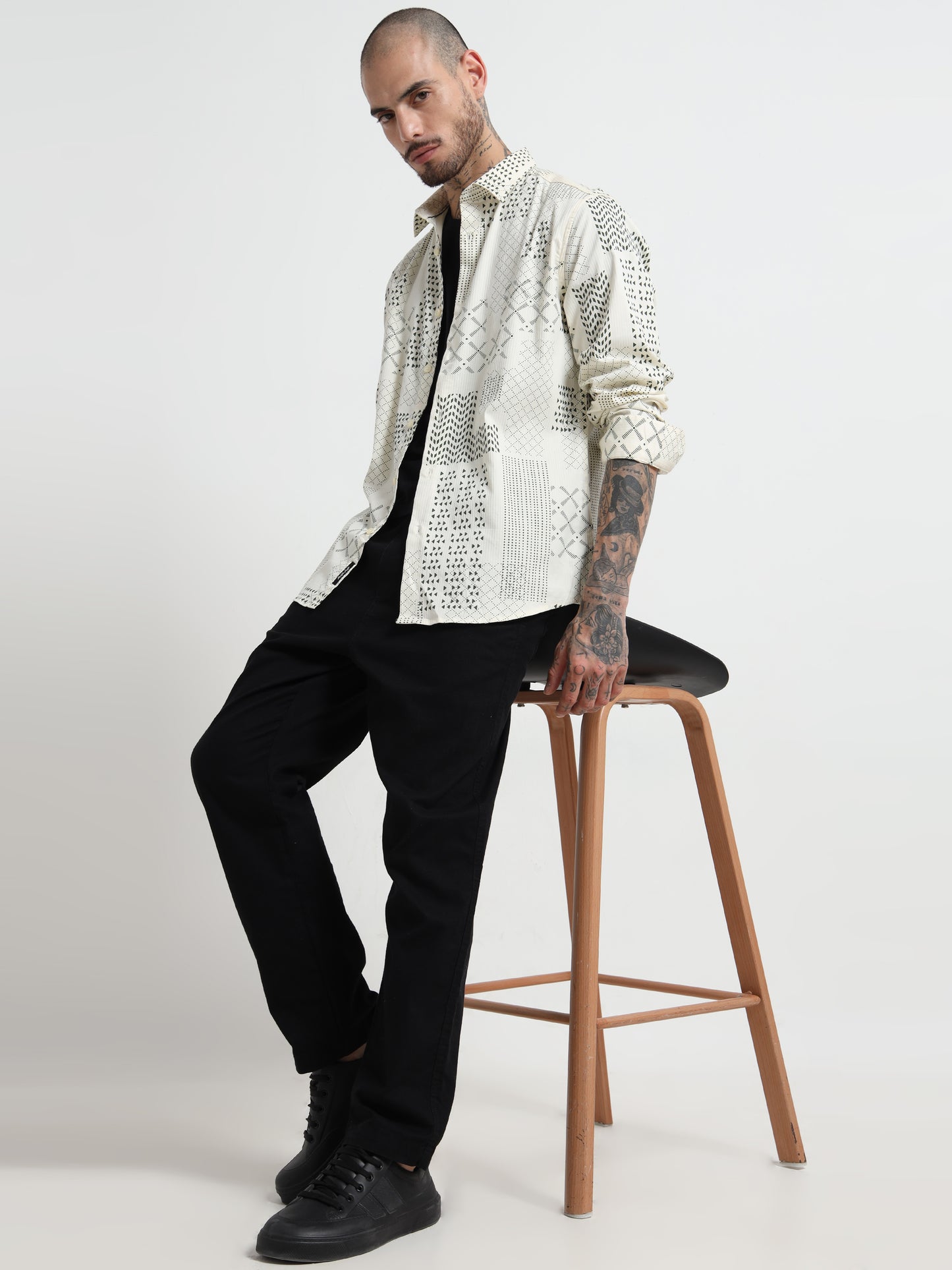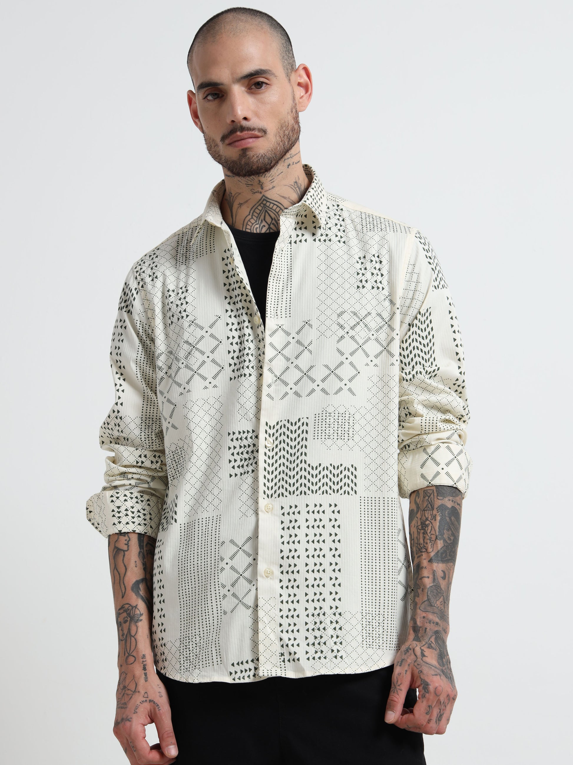 Redefine minimalism with a twist in this beige geometric print shirt for men. Featuring a grid of tribal and modern motifs in contrasting black, this full-sleeve shirt strikes the perfect balance between artistic and contemporary fashion. Crafted from soft, breathable cotton and tailored in a flattering slim fit, it’s ideal for casual Fridays or gallery-hopping weekends.